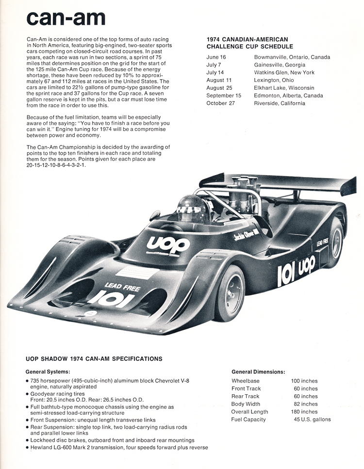 The team would partner with Universal Oil Products Company (UOP). UOP was founded to research, develop, and license processes for the petroleum industry, which was a good fit with Nicols' Advanced Vehicle Systems. In 1973, the team entered the Formula One World Championship. Drivers Jackie Oliver and George Follmer competed in the Shadow DN1. The following season, the team campaigned the DN3 in Formula One and DN4 in the Can Am series. Below is the content from the 1974 UOP Shadow Media Guide.