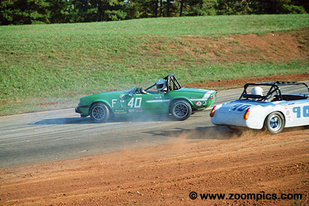 The F Production MG Midget driven by Stanley Fisher avoids the spinning Triumph Spitfire of Mark Van Orsdale. Van Ordale would finish nineteenth and Fisher thirteenth. |