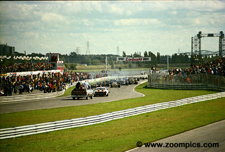 Twenty-four of the fastest qualifiers take the green with the chase vehicles in tow. Little did they know that their services would be needed. |