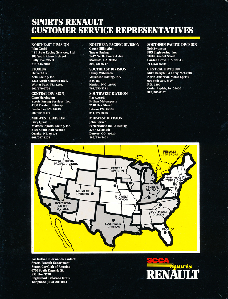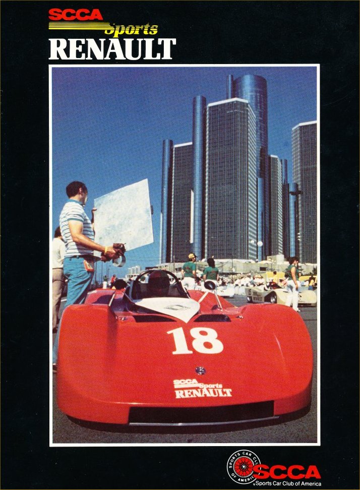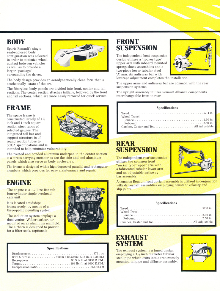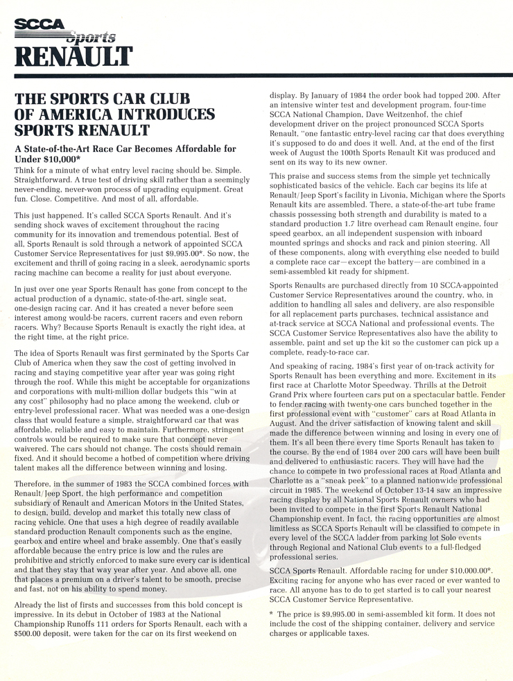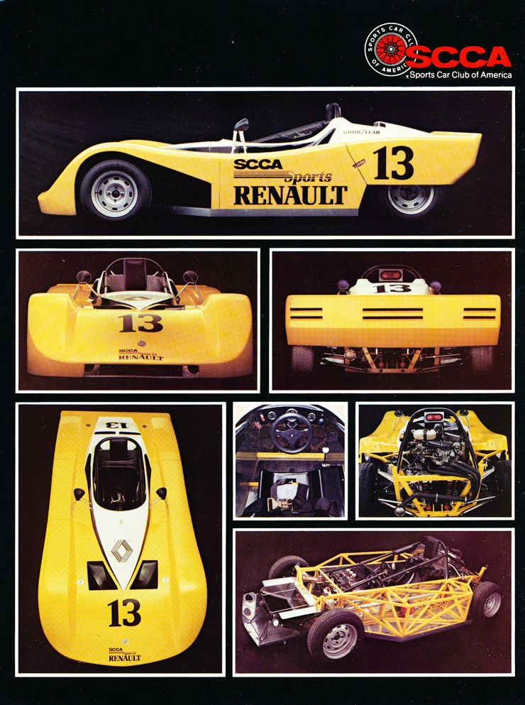 A low-cost sports racer was developed and manufactured by Renault / Jeep Sport USA under direction of retired racer Vic Elford. The Sports Renault was designed by Roy Lunn, who was head of engineering at American Motors from 1971 to 1987. The Sports Renault sold $9,995 and was an immediate success with over 200 orders received by January 1984. Although Renault / Jeep withdrew from the program in 1989 this inexpensive sports racer continued to be a very popular class. In 1993 the original Renaut units were replaced with Ford drivetrains and the category was renamed Spec Racer Ford. A third generation was announced in 2013 with an upgraded Ford engine package. It is called the Spec Racer Ford GEN3 or simply GEN3 and is a National class that competes at the annual SCCA Runoffs. Below is the brochure that introduced prosective buyers to the Sports Renault.