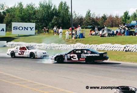 Dan Shirtliff in the No. 3 Chevrolet Monte Carlo and the Pontiac Grand Prix of Kelly Williams tangle in Mosport’s final turn –