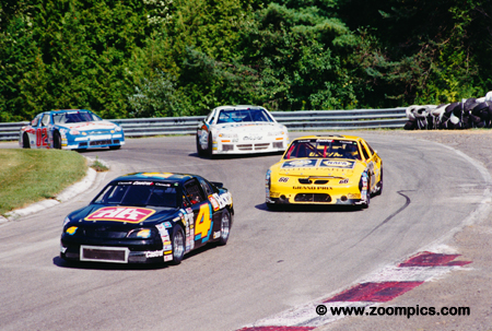 Don Thomson in the No. 4 Chevrolet Monte Carlo leads a group of cars through Moss corner.