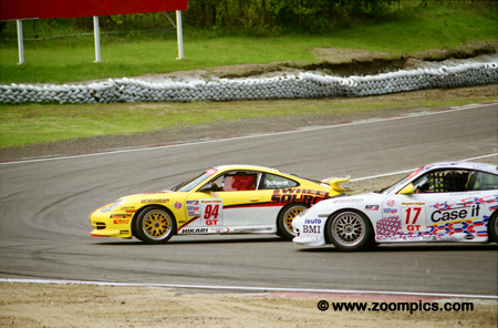 Number 94 driven by David Schardt gets his Porsche GT3 Cup sideways at Moss corner as No. 17 Adam Merzon in a similar model avoids him.