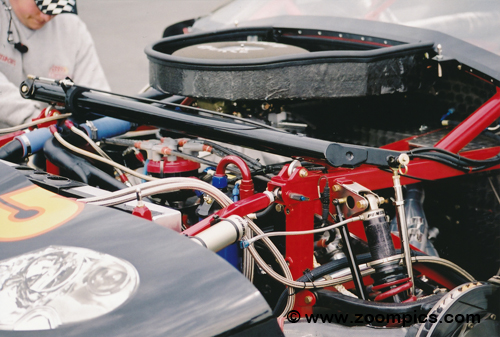 Sitting on top of the tube frame chassis is carbon fiber / Kevlar / honeycomb composite bodywork. The Sports Car of America introduced a new spec wing this year. The Rocketsport’s Jaguar is 190 inches long and 80 inches wide, with a height of 46.5 inches. The front suspension is an independent double wishbone while the rear is a live axle, three-link adjustable with a Watts link. All four corners use Penske adjustable shock absorbers. Stopping the XKR are Brembo brakes. As per the series rule, the Jaguar uses BFGoodrich g-Force T/A radials mounted on BBS modular alloy wheels: Front 12 X 16 inches and Rear 13 X 16 inches. |