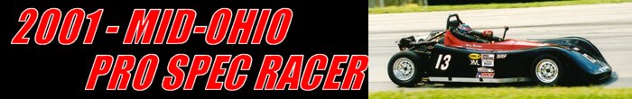 The 2001 season consists of eleven race weekends. Each contest is approximately fifty-miles in length. The year opens in April at Phoenix International Raceway. Teams travel north of the border for round two at Mosport International Raceway. During the first weekend of June, the series visits the Mid-Ohio Sports Car Course as a support event for the Grand-Am series. Next on the calendar is a trip to the west coast for a race at Sears Point Raceway. Following the event in California, teams stop at Chicago Motor Speedway and Watkins Glen International. Pro Spec Racer competitors head to Virginia International Raceway in early August and compete at the Cincinnati Municipal Lunken Airport a week later. Round nine, a month after Cincinnati, is held at Daytona International Speedway. The penultimate event is in mid-October at Lime Rock Park. The year ends at the San Diego Grand Prix. The Spec Racer Ford is a single-seat, open-cockpit tube-frame chassis sports racer manufactured by SCCA Enterprises in Colorado. The cars are identical and powered by a sealed four-cylinder, SOHC, 1.9-liter Ford engine with a five-speed transmission. This combination produces 105-horsepower and a top speed of 135-mph. The suspension uses a rocker arm design (front and rear) with coil-over shocks on each corner and adjustable front and rear sway-bars. Round three of the 2001 Pro Spec Series was conducted at the Mid-Ohio Sports Car Course as a support event for the Grand American Road Racing Association. Competitors would race for twenty-two laps around the thirteen-turn 2.258-mile road course.