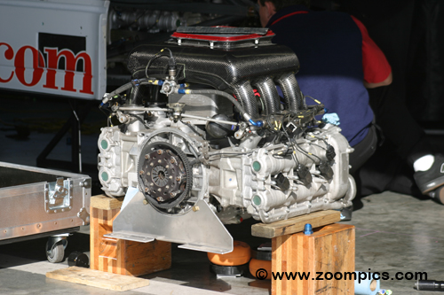 | The Brumos entries are powered by a Porsche flat-six engine. The motor has a displacement of 3,795 cc with a stroke of 76.4 mm and a bore of 99.99 mm. The intake system consists of six individual throttle bodies mated with a sequential multi-point Bosch MS 3.1 system with ignition control. Lubrication of the engine is accomplished using a dry sump with a heat exchanger. The exhaust system is fabricated by Fabcar. The output is rated at 500 horsepower at 8,500 rpm, with 420 Newton-meters of torque at 7,500. The Toyota engine in the Cegwa Fabcar is a 4.3-liter V8. It is a double-overhead camshaft motor with four valves per cylinder. The naturally aspirated fuel-injected engine delivers performance numbers similar to the Porsche. |