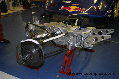 The Fabcar FDSC/03 powertrain consists of an EMCO GA 46-P 6-speed sequential transmission standard to cars competing in the Daytona Prototype category. Shifting is achieved by the use of a cable linkage. Bolted to the crankshaft is a custom Tilton / Porsche flywheel. The clutch is a triple plate metallic 5.25 inches in diameter, which is manufactured by Tilton. The clutch is engaged and disengaged using a Tilton aluminum throw-out bearing. The differential is an EMCO limited slip unit. An aluminum fabricated bell housing is used to mate the engine to the transmission to accommodate the different engine options. |