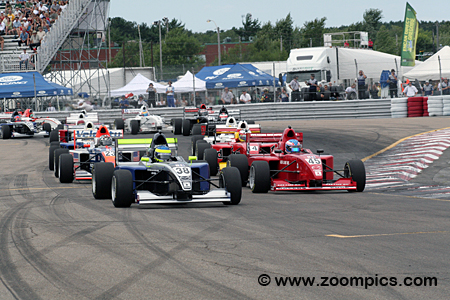 The pace lap and thirty-one competitors enter Trois-Rivieres's final turn for the start of round