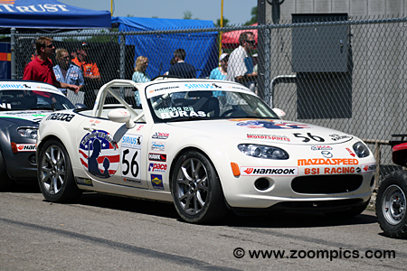 The series receives backing from Hawk Performance, Hankook, Mazda, Pace American, Sirius Satellite Radio, Racetech, Mothers Polish and The Winning Team. All Mazda MX-5 Cup cars receive only minor upgrades. Bolt-on modifications include a new intake manifold and exhaust system, which increases the engine output from 170 to 200-horsepower. All vehicles have a six-speed manual transmission and a limited-slip differential. The suspension uses a coil-over kit with double adjustable shock absorbers and roll bars. Hankook tires are mounted on 17X8" wheels. Brake pads, fluid and lines are upgraded for the demands of racing. The Mazdas are fitted with an eight-point roll-cage welded into the car, racing seatbelts and a fire extinguishing system for safety. The season consists of eight forty-five-minute timed contests. Round one is in early May at Mazda Raceway Laguna Seca, and the year's final race is held at Road America.