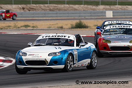 The series is part of the MAZDASPEED Motorsports Development Ladder that promotes champions of Mazda series to the next level of their career. The motivation for drivers to enter the MX-5 Cup division is an opportunity to earn a factory-supported ride in next year’s SCCA Pro Racing Speed World Challenge Touring Car Championship, which is valued at $250,000. All Mazda MX-5 Cup cars receive only minor upgrades. Bolt-on modifications include a new intake manifold and exhaust system which increases the engine output from 170 to 200-horsepower. All the vehicles are equipped with a six-speed manual transmission and a limited-slip differential. The suspension uses a coil-over kit with double adjustable shock absorbers and roll bars. Khumo tires are mounted on 17X8” wheels. Brake pads, fluid and lines are upgraded for the demands of racing. For safety, the Mazdas are fitted with an eight-point roll-cage welded into the car, racing seatbelts and a fire extinguishing system. The season consists of eight 45-minute timed races. The first event of 2008 will be held in May at Road Atlanta. Three weeks later, teams travel to Canada for round two. There is a break until July and then contests are conducted at Portland and Road America. Following these two races, the series returns to Canada to compete on the streets of Trois-Rivieres. In September, there are race weekends at Miller Motorsports Park and Thunderbolt Raceway. The finale is held in mid-October at Mazda Raceway Laguna Seca. Round six of the 2008 SCCA Pro Racing Playboy Mazda MX-5 Cup was held at Miller Motorsports Park. Drivers would compete on the twenty-three turn 4.486-mile road course for forty-five minutes.