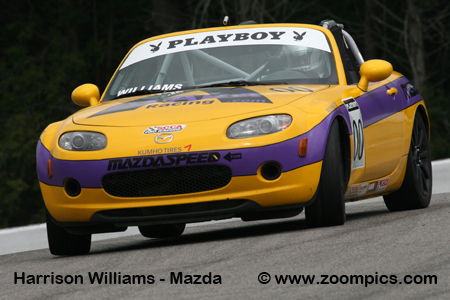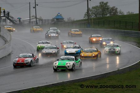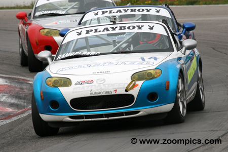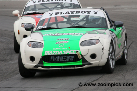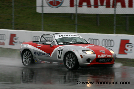 The series is part of the MAZDASPEED Motorsports Development Ladder that promotes champions of Mazda series to the next level of their career. The motivation for drivers to enter the MX-5 Cup division is an opportunity to earn a factory-supported ride in next year’s SCCA Pro Racing Speed World Challenge Touring Car Championship, which is valued at $250,000. All Mazda MX-5 Cup cars receive only minor upgrades. Bolt-on modifications include a new intake manifold and exhaust system which increases the engine output from 170 to 200-horsepower. All the vehicles are equipped with a six-speed manual transmission and a limited-slip differential. The suspension uses a coil-over kit with double adjustable shock absorbers and roll bars. Khumo tires are mounted on 17X8” wheels. Brake pads, fluid and lines are upgraded for the demands of racing. For safety, the Mazdas are fitted with an eight-point roll-cage welded into the car, racing seatbelts and a fire extinguishing system. The season consists of eight 45-minute timed races. The first event of 2008 will be held in May at Road Atlanta. Three weeks later, teams travel to Canada for round two. There is a break until July and then contests are conducted at Portland and Road America. Following these two races, the series returns to Canada to compete on the streets of Trois-Rivieres. In September, there are race weekends at Miller Motorsports Park and Thunderbolt Raceway. The finale is held in mid-October at Mazda Raceway Laguna Seca. Round two of the 2008 SCCA Pro Racing Playboy Mazda MX-5 Cup was held at Mosport International Raceway during the Victoria Day Speedfest Weekend. Drivers would compete on the very wet ten-turn 2.459-mile road course for 45-minutes.