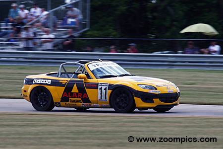 The series is part of the MAZDASPEED Motorsports Development Ladder that promotes champions of the Mazda series to the next level of their career. The motivation for drivers to enter the MX-5 Cup division is an opportunity to earn a factory-supported ride in next year's SCCA Pro Racing Speed World Challenge Touring Car Championship, valued at $250,000. All Mazda MX-5 Cup cars receive only minor upgrades. Bolt-on modifications include a new intake manifold and exhaust system, which increases the engine output from 170 to 200-horsepower. All vehicles have a six-speed manual transmission and a limited-slip differential. BF Goodrich tires are mounted on 17X8" wheels. The suspension uses a coil-over kit with double adjustable shock absorbers and roll bars. Brake pads, fluid and lines are upgraded for the demands of racing. The Mazdas are fitted with an eight-point roll-cage welded into the car, racing seatbelts and a fire extinguishing system for safety. The 2009 season consists of ten 45-minute timed races. The first event of the year was held at Road Atlanta and ended in October with a doubleheader at Virginia International Raceway.