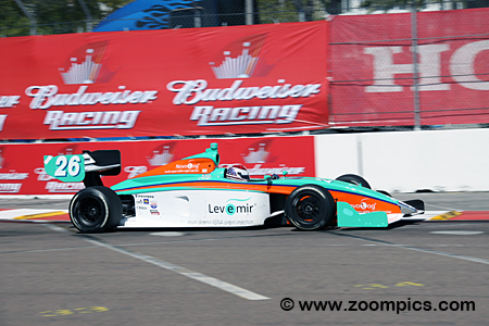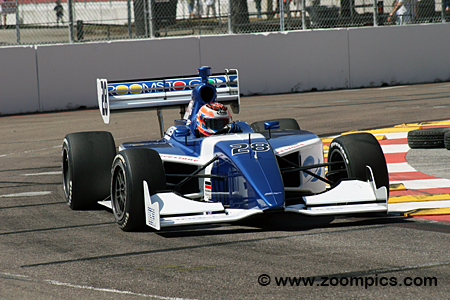 Drivers compete in the Dallara IPS, designed and manufactured for the Infiniti Pro Series. The open-wheel, single-seat racer is equipped with a ground-effect underbody and outboard wings front and rear. The monocoque chassis is constructed using carbon fiber and composites. The Dallara has a minimum weight of 1,430 pounds, which includes all lubricants and coolants used during the event, but does not include fuel or the driver. Firestone Firehawk racing tires are mounted on 15-inch diameter x 10 front and 15-inch diameter x 14 rear wheels. The car is powered by a 3.5-liter Infiniti Q45 engine which produces approximately 450 horsepower and is fitted to a Ricardo six-forward gear transmission with a sequential shifter. Infiniti Pro Series costs are tightly controlled by the Indy Racing League, with the Dallara IPS costing $137,900 (including the data acquisition system). Round one of the 2010 Firestone Indy Lights series was the Firestone Indy Lights Grand Prix of St. Petersburg. Competitors would race around the fourteen-turn 1.800-mile temporary street course. There were a total of sixteen starters. The race was initially scheduled as a forty-five-lap contest, but it became a timed event after many crashes and began to rain. The leader completed thirty-five laps.