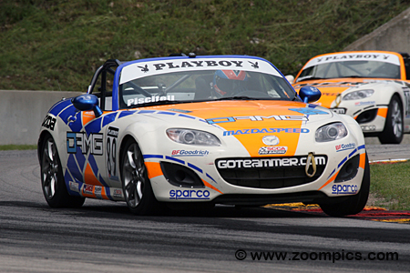 The series is part of the MAZDASPEED Motorsports Development Ladder that promotes champions of Mazda series to the next level of their career. The motivation for drivers to enter the MX-5 Cup division is an opportunity to earn a factory-supported ride in next year’s SCCA Pro Racing Speed World Challenge Touring Car Championship, which is valued at $250,000. All Mazda MX-5 Cup cars receive only minor upgrades. Bolt-on modifications include a new intake manifold and exhaust system which increases the engine output from 170 to 200-horsepower. All the vehicles are equipped with a six-speed manual transmission and a limited-slip differential. The suspension uses a coil-over kit with double adjustable shock absorbers and roll bars. Khumo tires are mounted on 17X8” wheels. Brake pads, fluid and lines are upgraded for the demands of racing. For safety, the Mazdas are fitted with an eight-point roll-cage welded into the car, racing seatbelts and a fire extinguishing system. The 2010 season consists of eleven 45-minute timed races. The first event of the year was held at Virginia International Raceway and ended in September with a doubleheader at Miller Motorsports Park.