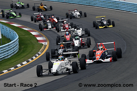 The cars competing in the Formula 2000 Championship Series conform to the Sports Club of America’s (SCCA) Formula Continent class. They are single-seat, rear-engine, open-wheel vehicles constructed with a tube frame chassis. Manufacturers producing series chassis include Carbir, Mygale, Tatuus, Piper and Citation, and RFR (Firman Cars), but the most popular choice is Van Diemen. The suspensions are independent – both front and rear. Shock absorbers and sway bars are adjustable. All competitors use the older 2.0-liter SOHC four-cylinder or, the newer Zetec Ford engine. A four-speed, non-synchro gearbox is used. Sequential transmissions are not permitted. The series is open to all competitors with an SCCA National or SCCA Pro Racing license. In addition to Hoosier Tires, the championship receives support from PI Research, Intercomp Racing Systems, Racing Electronics, Pennon and Mathisen Media. The championship consists of seven doubleheader weekends, each contested on road courses. The season begins in April at Virginia International Raceway and ends with the final two races at Watkins Glen International.