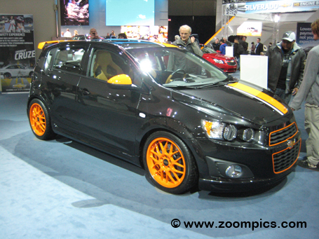 The standard motor is a 1.8 liter DOHC four-cylinder. The Sonic on display has an aftermarket body kit.