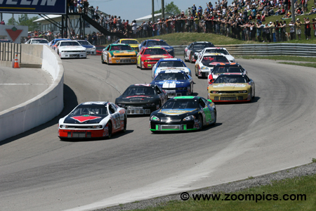 Leading the field into corner one is Scott Steckly driving the Canadian Tire Dodge Challenger.