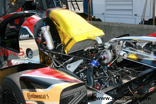 The DeltaWing was initially powered by a 1.6-liter Nissan DIC-T motor. However, in 2013, the team produced an in-house engine. The Elan Technologies 4-cylinder is made from a billet block. It uses a Mazda MZR direct injection cylinder head and a Borg-Warner 6758 turbocharger. The motor weighs 80kg. The displacement is 2.0 liters, producing 350 horsepower at 6,800 rpm using VP 100 Octane E10 fuel. The top speed is 200 mph. Bolted to the motor is a six-speed EMCO EGB66 gearbox with a pneumatic paddle shift. |