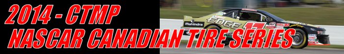 The 2014 championship opened at Canadian Tire Motorsport Park as it had done since 2012. The schedule looked much as it had in 2013. The opening round was followed by two events in Quebec - Autodrome Chaudiere and Circuit ICAR. The series then headed to western Canada and competed at Edmonton International Raceway and the Auto Clearing Motor Speedway in Saskatoon. Then the championship returned to Quebec for races at Autodrome Saint-Eustache and Circuit Trois-Rivieres. Next on the schedule was Riverside International Speedway and the second visit to Canadian Tire Motorsport Park. The season finale was held at Kawartha Speedway. The series cars are constructed to specifications and rules common to most stock car series. The chassis is a steel tube frame design covered with a fiberglass body and is required to weigh no less than 3000-lbs. Body styles are from manufacturers such as Dodge (Avenger, Challenger and Charger), Ford (Fusion) and Chevrolet (Monte Carlo and Impala SS). Engine type and displacement are dictated by the make and model of the vehicle. The carbureted eight-cylinder motors produce approximately 650-horsepower. Round, nine of the eleven contested during the 2014 NASCAR Canadian Tire season, took place at Canadian Tire Motorsport Park. The race was held on the same weekend as the NASCAR Camping World Truck Series. Thirty-one drivers would compete for fifty-one laps (201.8-kilometers) around the ten-turn 2.459-mile road course. |