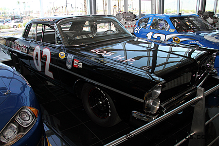 Squeezed between two modern-day NASCAR vehicles is this 1963 Pontiac Catalina driven by Roger Penske.