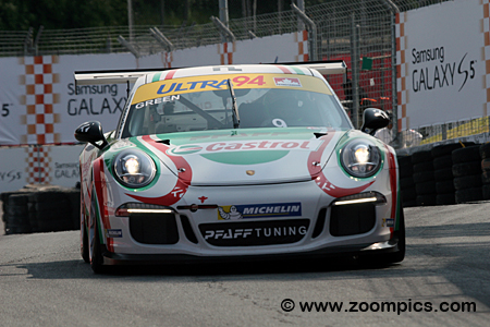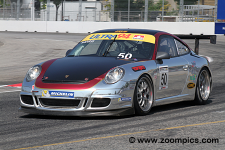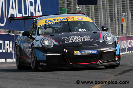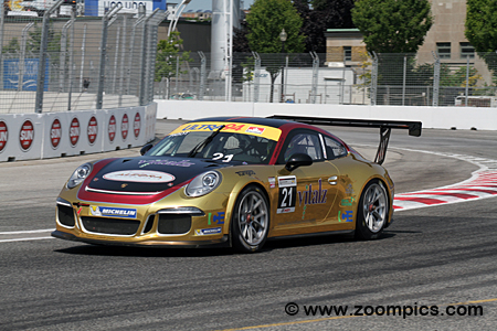 A 3.8-liter aluminum six-cylinder engine powers the current generation Porsche GT3 Cup. The motor produces 460-horsepower at 8,500-rpm and is fitted to a six-speed sequential transmission. Stopping the Porsche are aluminum six-piston calipers on the front – while the rear is equipped with four-piston calipers. The alloy rims on the front of the Porsche are 9.5J X 18 and use 24/64-18 Michelin tires. And, on the rear are 12J X 18 wheels with 30/68-18 tires. The GT3 Cup weighs just over 1,180-kg. Rounds five and six of the 2014 Porsche GT3 Cup Challenge Canada were held at Toronto’s Exhibition Place as a support event for the Honda Toronto Indy. Competitors would race around the eleven turn 1.786-mile temporary street circuit in two forty-five-minute heat races. Due to rain delays on Saturday, the first contest of the weekend was reduced to thirty-nine-minutes. |