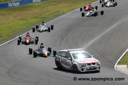 Pictured is the Shannons Nationals’ Safety Car leading the field through corner six under yellow conditions.
