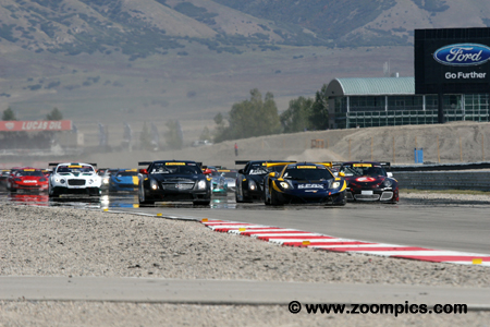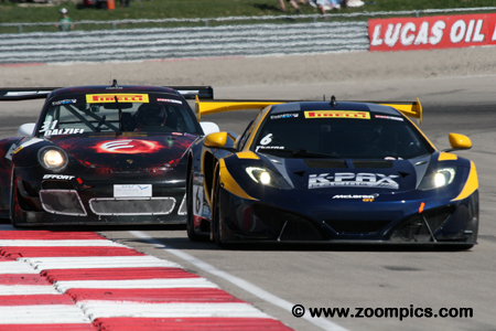 Robert Thorne in the K-PAX Racing McLaren 12C GT3 jumps into the lead and is followed by the Cadillac’s of Johnny O’Connell