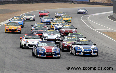 The series is part of the MAZDASPEED Motorsports Development Ladder that promotes champions of the Mazda series to the next level of their career. The motivation for drivers to enter the MX-5 Cup division is an opportunity to earn a factory-supported ride in next year’s SCCA Pro Racing Speed World Challenge Touring Car Championship. All Mazda MX-5 Cup cars receive only minor upgrades. Bolt-on modifications include a new intake manifold and exhaust system, which increases the engine output from 170 to 200-horsepower. All vehicles have a six-speed manual transmission and a limited-slip differential. BF Goodrich tires are mounted on 17X8” wheels. The suspension uses a coil-over kit with double adjustable shock absorbers and roll bars. Brake pads, fluid and lines are upgraded for the demands of racing. The Mazdas are fitted with an eight-point roll-cage welded into the car, racing seatbelts and a fire extinguishing system for safety. In December 2011, it was announced that the series would include a second class. Beginning this year, there is a category for Skip Barber Racing School competitors. The Skip Barber Racing School will provide an arrive-and-drive program in their Mazda MX-5s. The cost includes a test day, tires, fuel, entry fees, in car-video and data feedback, in car radio setup and television exposure. The 2015 season consists of twelve forty-minute timed races spread over six weekends. All weekends host doubleheaders. The first event of the year will be held in March at Sebring International Raceway and the year will end at Road Atlanta in October.