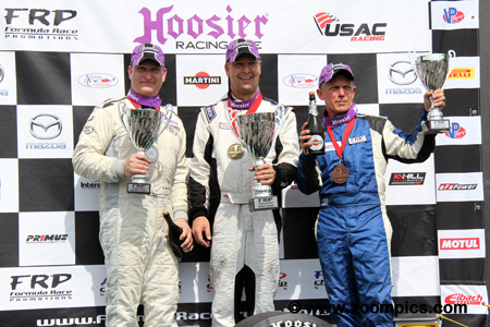 Sunday’s Formula Atlantic podium. In the center is the race winner, Peter Portante who drove the K-Hill Motorsports prepared Swift 016.