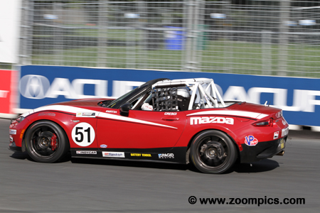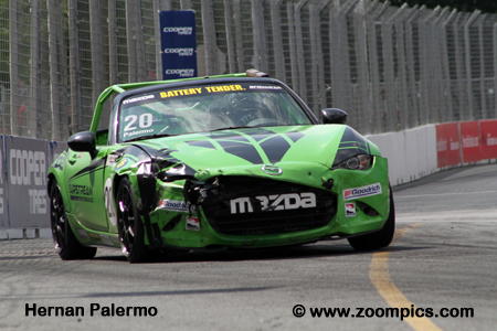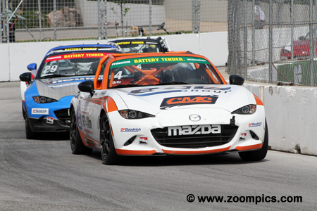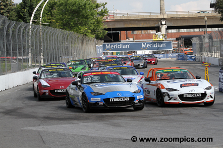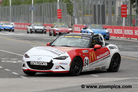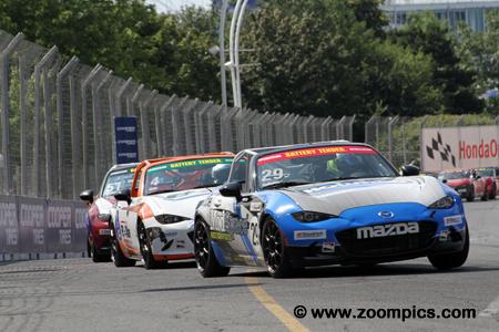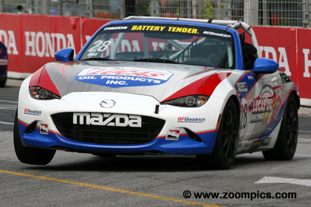 The MX-5 Cup race cars are prepared to series standards by Long Road Racing. The process includes disassembly of the car, welding in a roll cage and the addition of more than 250 motorsports-components. To ensure parity, the SKYACTIV 2.0-liter engine, ECU, six-speed transmission and the limited-slip differential are sealed. The cars can be purchased from Mazda Motorsports for $58,900 USD. The 2017 championship is contested at six different race tracks – Barber Motorsports Park, Indianapolis Motor Speedway, Road America, Streets of Toronto, Watkins Glen International and the finale at Mazda Raceway Laguna Seca. Each race weekend includes two forty-five minute contests. And, to motivate drivers and advance their racing career the Global MX-5 Cup champion earns a $200,000 scholarship. For the first time, the Battery Tender Global MX-5 Cup drivers would compete at Toronto’s Exhibition Place. Two forty-five minute races would take place on the 2.82 kilometers (1.755-mile) eleven turn temporary street course. |
