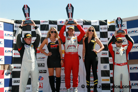 The round fourteen Pirelli World Challenge Grand Touring Sport podium at the Utah Motorsports Campus.