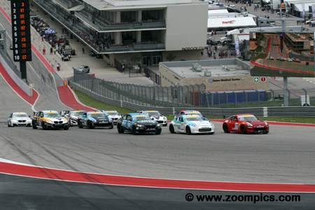 Seventeen cars head up the hill and into corner one at Circuit of the Americas.