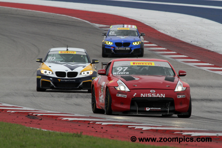 Charging from fifth on the grid to second place is the orange Nissan 370Z of Tony Rivera.