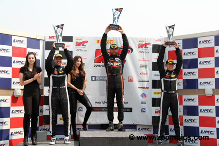 The round nine Pirelli World Challenge Touring Car podium at the Utah Motorsports Campus. On the left is the runner-up