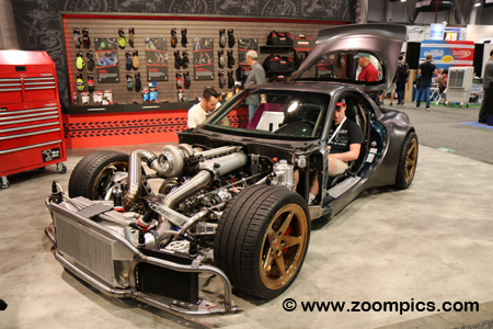 Manufacturers such as Ford and GM used SEMA to showcase their crate engine offerings for car builders and racers. This particular engine is from XVI Power and is for marine applications. The V16 motor can be purchased as a naturally aspirated version (1,200-1,400-horsepower) or supercharged (2,000-horsepower). The technical highlights include an aluminum block and a billet crankshaft and camshaft.
