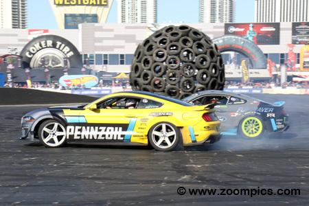 Most of the Silver Parking lot in front of the Las Vegas Convention Center is occupied by Ford. Ford has brought an exciting promotional/marketing program to SEMA that allows them to showcase the performance of their vehicles, which they call ‘Ford out Front.’ The space includes Ford Performance parts and their licensed partners. But the highlight is the drifting demonstrations, which allow attendees to ride along.