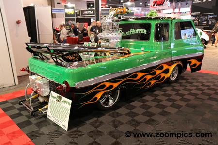 You are looking at a 1965 Ford Econoline dubbed The Grasshopper. Owned by Tom Antunes, the Grasshopper was created by Brea Rods & Classics. Aside from the graphics, one of the most striking features of the vehicle is the powertrain. In the bed of the truck is a 460-cu.in. V8 equipped with two 750-cfm Edelbrock carburetors mounted on an 871 Hampton blower. The unique position of the engine requires boat headers.