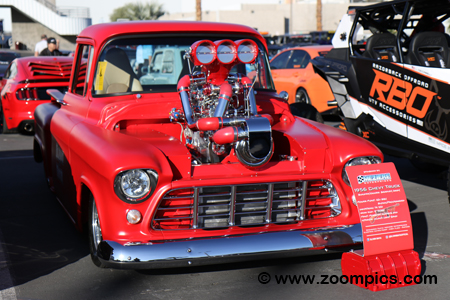 Builder/owner Bradley Gray’s 1956 Chevrolet Pickup truck is sponsored by Meziere Enterprises. Meziere is a company that provides a variety of performance parts. Gray’s truck is finished with Porsche’s Guards Red paint and the interior is Allanti Light Sand. The powertrain is comprised of a blown/procharged 461-cu.in. V8 engine. The power is transferred to a turbo-hydromantic transmission and a Ford 9-inch differential.
