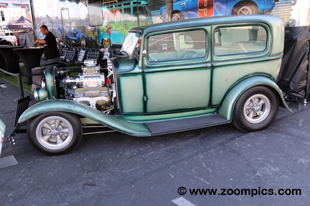 Medusa is a 1932 Ford Tudor Sedan from the Galpin Speed Shop in Van Nuys, California. The steel-bodied car is finished with a light metallic green and highlighted with dark green fogging nitrocellulose lacquer paint. Under the hood is a blown 415-horsepower 383-cu.in. V8 crate motor. The aluminum wheels are Ansen’s Top Eliminator. And, the upholstery is by Elegance Auto Interiors.