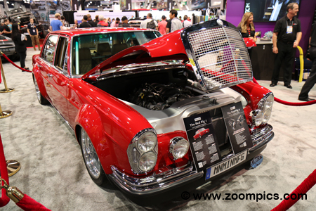 The Red Pig 2 came off the assembly line as a 1969 Mercedes-Benz. The Mercedes was customized by Vescio. It has a stock grille but the car has been turned into a wide body that has been painted with a 2010 Mercedes colour called Mars Red. The wheels on the front are Forgeline LS3 – 18X12 and the rear are 19X13. Wilwood six-piston calipers are used to stop the vehicle. The interior has also been replaced with Italian leather.
