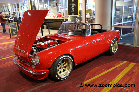 This is a 1968 Dodge D200 pickup, which was in the MOPAR booth. This custom is named Lowliner and is finished with a paint colour called Delmonico Red. The powertrain in the Lowliner includes a 5.9-liter Cummins diesel engine equipped with a six-speed manual transmission. Other details include 22-inch diameter wheels and an air suspension, which can be adjusted. One of the final touches is shaved door handles.