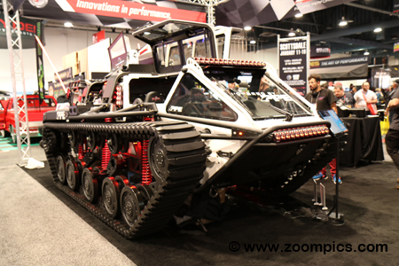 Just when you think you’ve seen it all, you will stumble across something like this at the SEMA show. This the Ripsaw powered by Pacific Performance Engineering (PPE). PPE specializes in diesel performance upgrades. The all-terrain Ripsaw is powered by an 800-horsepower 6.6-liter Duramax engine built by PPE. The custom Allison transmission has also received special attention from PPE.