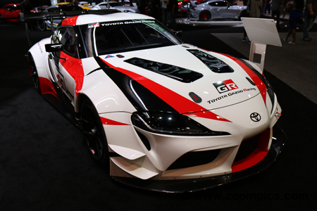 The make and model receiving the most attention at the SEMA show was Toyota’s new Supra. A lot of customizing shops displayed their take on what could be updated and changed on the fifth-generation Supra. Toyota also brought a number of modified Supras, including this road racing version constructed by Toyota Gazoo Racing. The main features of this car are the aero package (splitter and wing), which are made of carbon fiber.