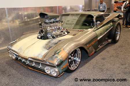 This rat rod rolled off the assembly line as a 1959 El Camino. Protruding through the hood is a 400-cu.in Dart small block engine equipped with a 6-71 BDS supercharger. This combination produces 800-horsepower. To handle this kind of power, the vehicle is equipped with Monster Transmission’s 700R4 and a Strand Dana 60 differential. The El Camino rolls on Mickey Thompson tires, which are mounted on American Racing Wheels.
