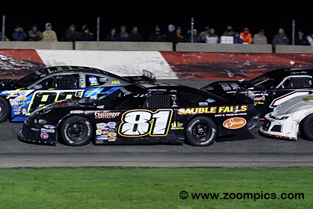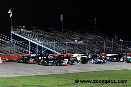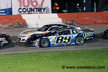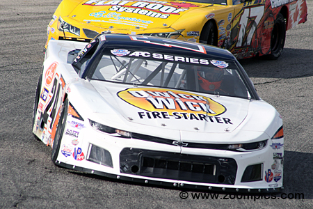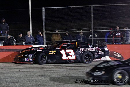 The Late Model class cars are constructed to specifications common to most stock car series. The chassis is a steel tube frame covered with a fiberglass body. Depending on the engine choice, a car can weigh as much as 2800-lbs. Unlike the popular APC series, this event allowed teams to compete with crate engines or built motors. There are also rules which restrict the options available for transmissions, ignition components, body material, brakes, etc. The final event was initially scheduled for October 3; however, rain forced the organizers to postpone. The next available date was October 16, but a wet forecast prevented racing. The contest was held the following day – albeit with two rain delays in the afternoon. Heading into the finale, Shawn Chenoweth and Shae Gemmel led the standings, with Kyle Steckly trailing by six markers. The Grisdale Late Model race was a one-hundred-lap contest around the 1/3-mile semi-banked asphalt oval during Flamboro Speedway’s annual Frostoberfest.