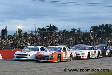 The field of nineteen entries lines up on Flamboro Speedway’s backstretch for the start of the fifty-lap Qwick Wick Super Stock contest.