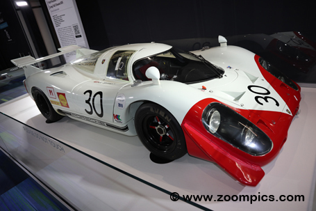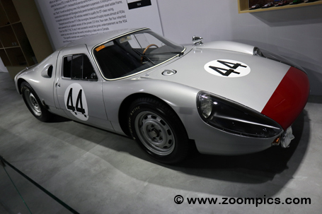 On loan from the Ingram Collection was this 1964 Porsche 904 Carrera GTS. With the withdrawal of Formula One in 1962, Porsche switched their focus to sports car racing. The company's first effort was the 904, which won its class at the 12 Hours of Sebring. Almost all 904s were powered by the 2.0-liter four-camshaft flat-four engine from the Porsche 718. The power output for this 655 kg Porsche is 180 horsepower at 7,000 rpm with a top speed of 260 km/h. |