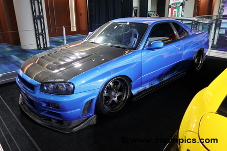 Another vehicle in the Revzone exhibit was the 1998 Nissan Skyline R34. All Skylines are imported as they were never available for sale by North American Nissan Dealers. This R34 is the fifth generation of Skyline built from 1998 to 2002. The early models were equipped with a 2.6-liter twin-turbocharged inline-six-cylinder engine called an RB26DETT. Connected to the engine is a 6-speed Getrag 233 manual transmission. This R34 has been upgraded with an intercooler and 550cc fuel injectors. |
