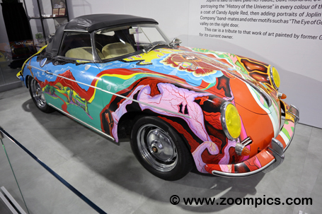 | The Cobble Beach Classics exhibit also included a Janis Joplin tribute car. The Porsche on display is a 1962 356B 1600 Roadster powered by a 1.6-liter 4-cylinder air-cooled Boxer motor that produces 59 horsepower at 4,500 rpm. Joplin's original Porsche was a 1964 model. She paid one of her roadies, Dave Richards, $500 to paint the car. The 356 portrays the universe's history and includes every colour of the rainbow. This was Joplin's daily driver. |