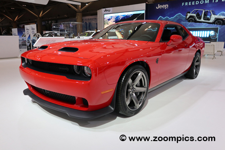 | The Chrysler exhibit included the 2022 Dodge Challenger SRT Hellcat. The model shown has the 6.2 liter supercharged SRT HEMI V8. Transferring the power to the rear wheels is an eight-speed TorqueFlite high-performance automatic transmission. Standard equipment includes competition suspension with adaptive damping, dual-scoop hood, heated front seats and steering wheel and SRT Performance Pages with configurable drive models and launch control. |